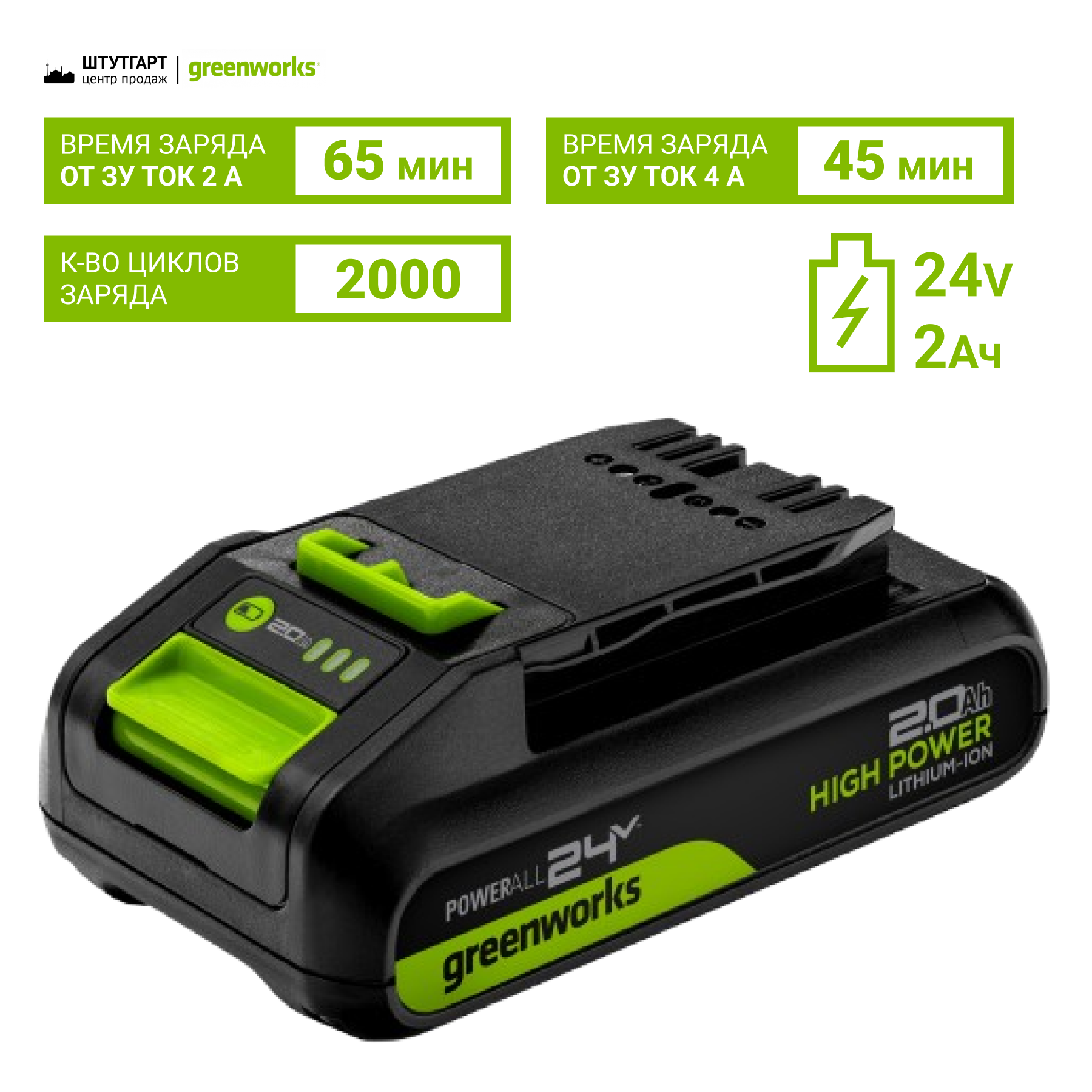 Обновленная электроника Greenworks Intelligent Power обеспечивает высокую отдаваемую мощность и управляет батареей, инструментом и зарядным устройством для максимальной производительности. Система Greenworks Intelligent Power защищает аккумулятор от перегрева, перегрузки, глубокого разряда и перезаряда, продлевая срок службы. Батарея построена на основе литий-ионных элементов типа 18650, не имеющих эффекта памяти, с минимальным саморазрядом во время хранения.