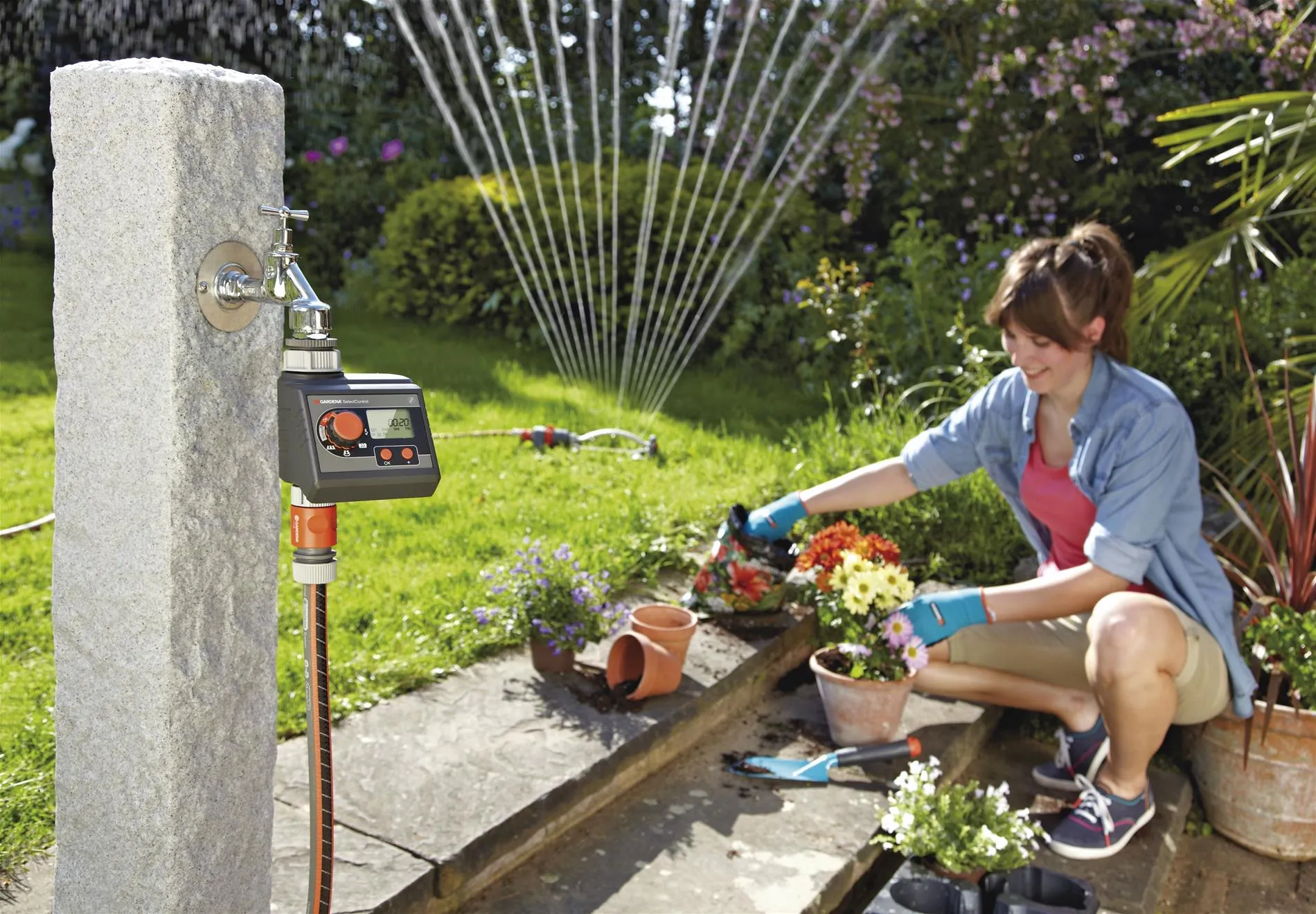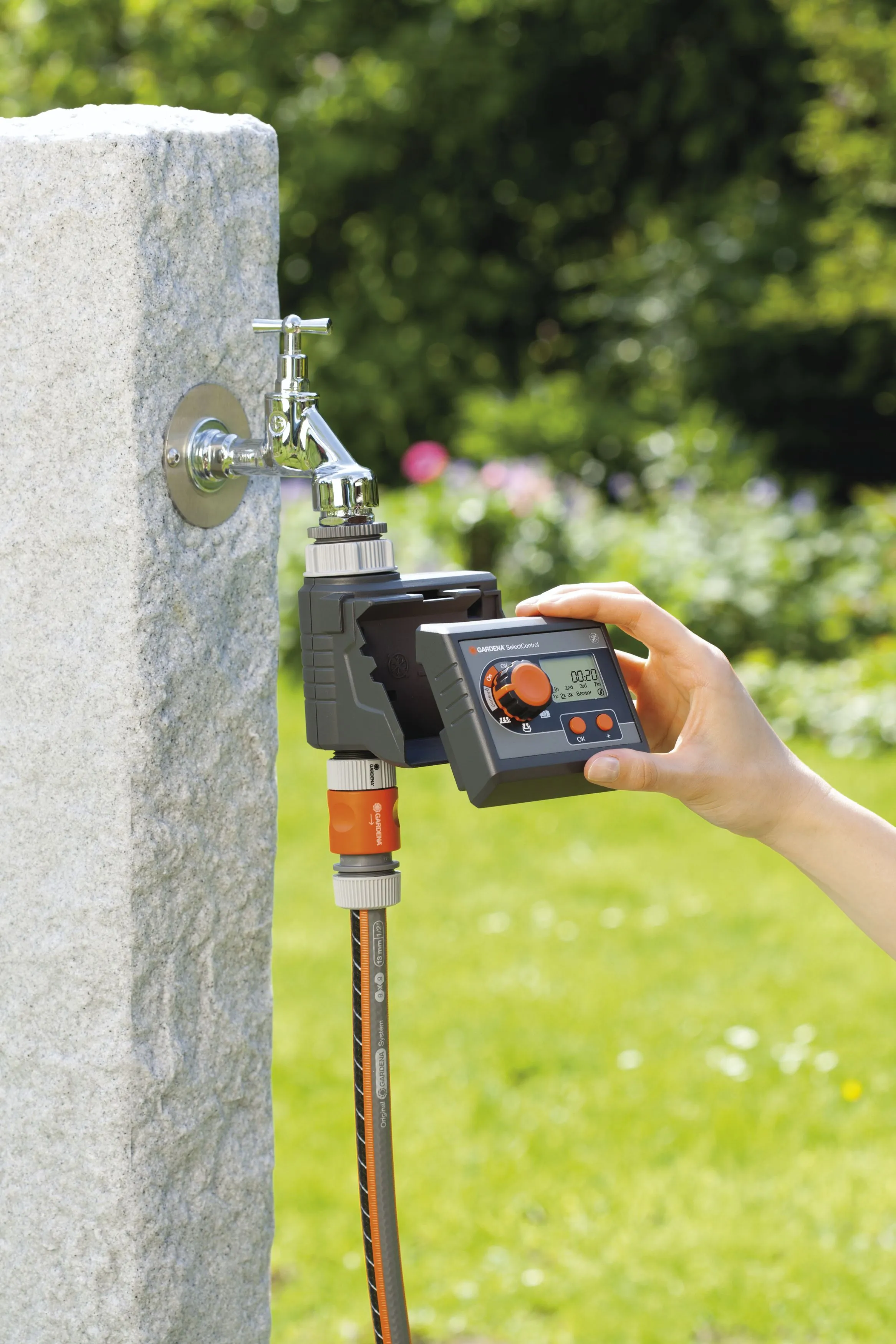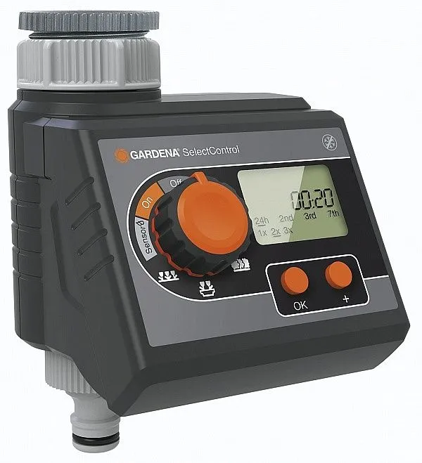 Представленная модель сделает полив вашего сада одним из необременительных занятий. Она предоставит вам 5 предустановленных программ для орошения газона, живых изгородей, грядок, цветочных горшков. Съемный дисплей позволяет осуществлять программирование таймера с большим комфортом. Представленное приспособление будет работать согласно установленным вами требованиям. Для контроля за расходом воды вы можете подключить датчик дождя и датчик влажности почвы.