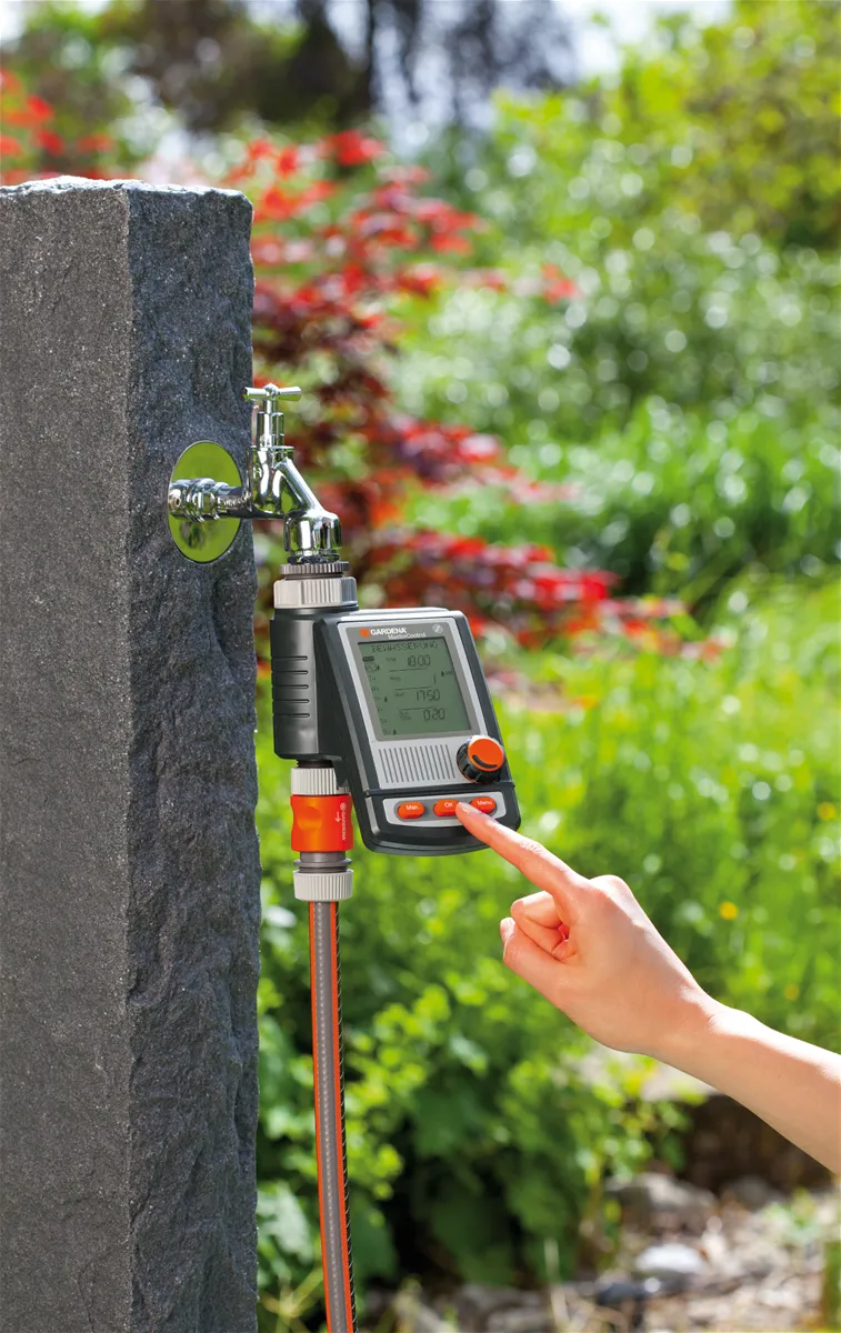 Эффективным вариантом для автоматического управления устройствами для полива будет надежный и удобный в управлении таймер подачи воды Gardena C 1060 plus. Он устанавливается на водопроводный кран и позволяет удобно задавать время орошения. Данное приспособление оснащено большим четким дисплеем, на котором отображается пошаговая инструкция для последовательного настраивания необходимых параметров. С помощью этого агрегата вы сможете выбрать до 6 различных программ полива продолжительностью от 1 минуты до 9 часов 59 минут. Такая модель таймера также позволит садоводу осуществлять отдельное управление каждым из 6 подключенных устройств. Для стабильной работы в течение года представленный аппарат использует одну щелочную батарейку.