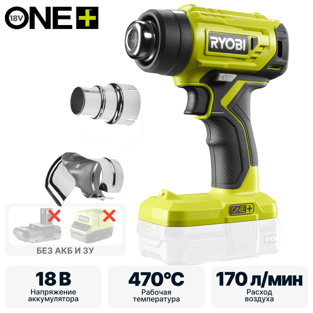 18 В, время нагрева 1 мин, 170 л/мин, 470°, регулировка температуры, подсветка, вес 0,6 кг