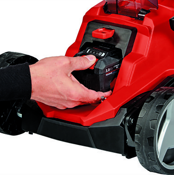 Встроенная ручка для переноски облегчает транспортировку косилки. Беспроводная косилка работает с аккумуляторной батареей 18 В.