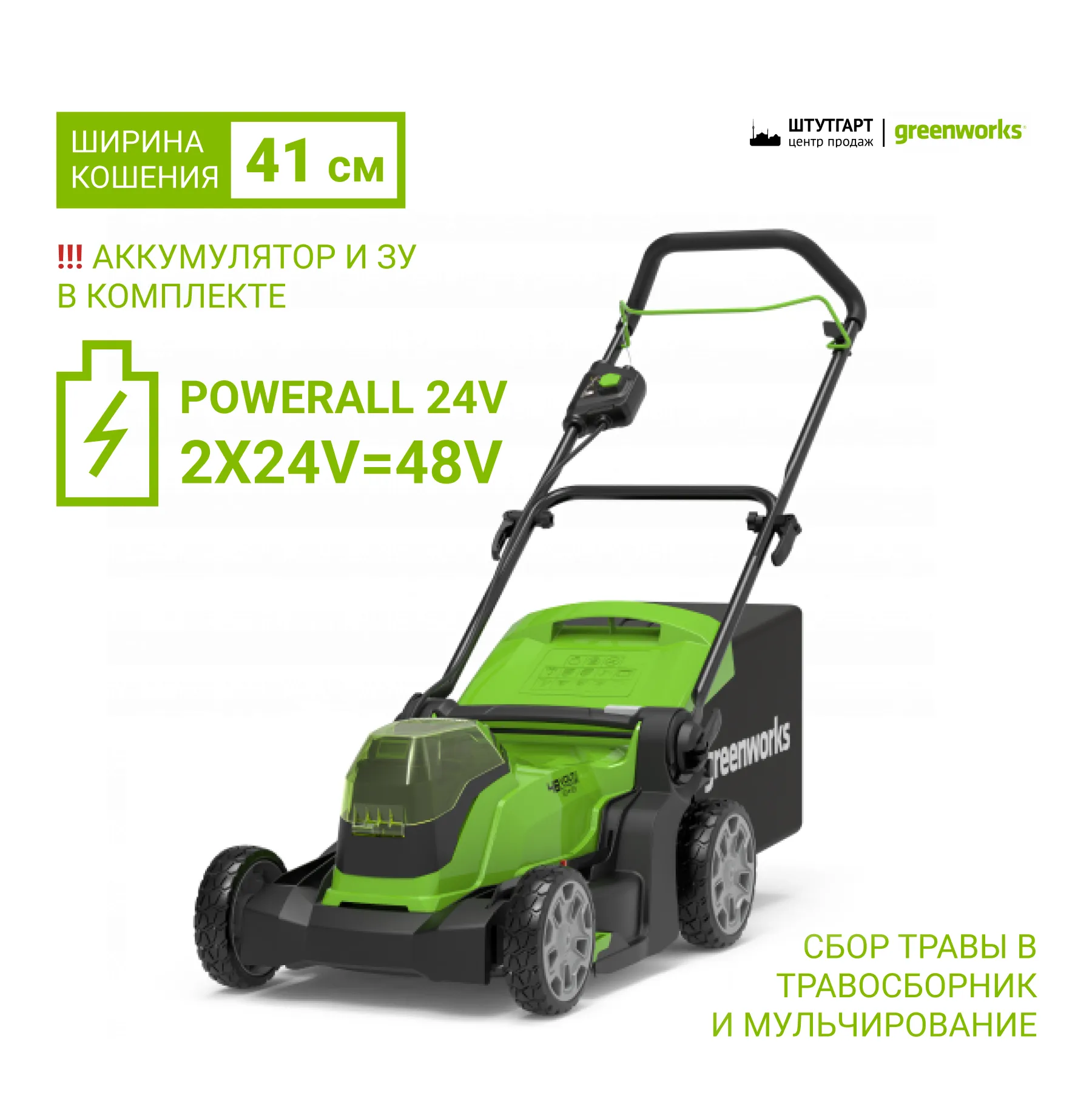 Комплект поставки | Аккумуляторная газонокосилка Greenworks; Две аккумуляторные батареи Greenworks 24V, 4Ач; Зарядное устройство Greenworks 24V, 2А; Травосборник; Руководство по эксплуатации; Гарантийный талон. |
