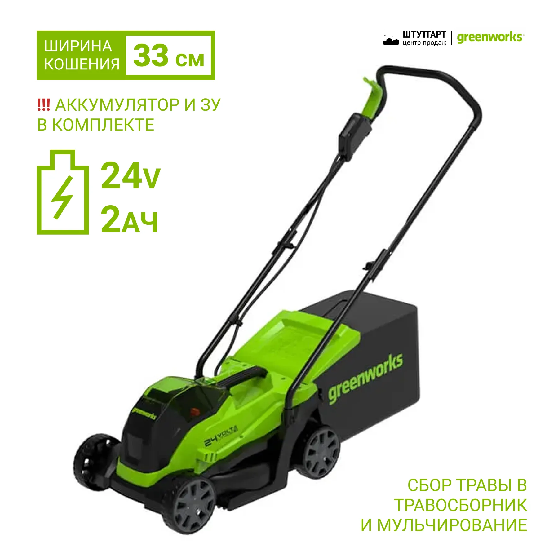Работа от Li-ion аккумулятора 24V совместимого c 70 инструментами для сада, дома и мастерской из линейки Greenworks 24V.