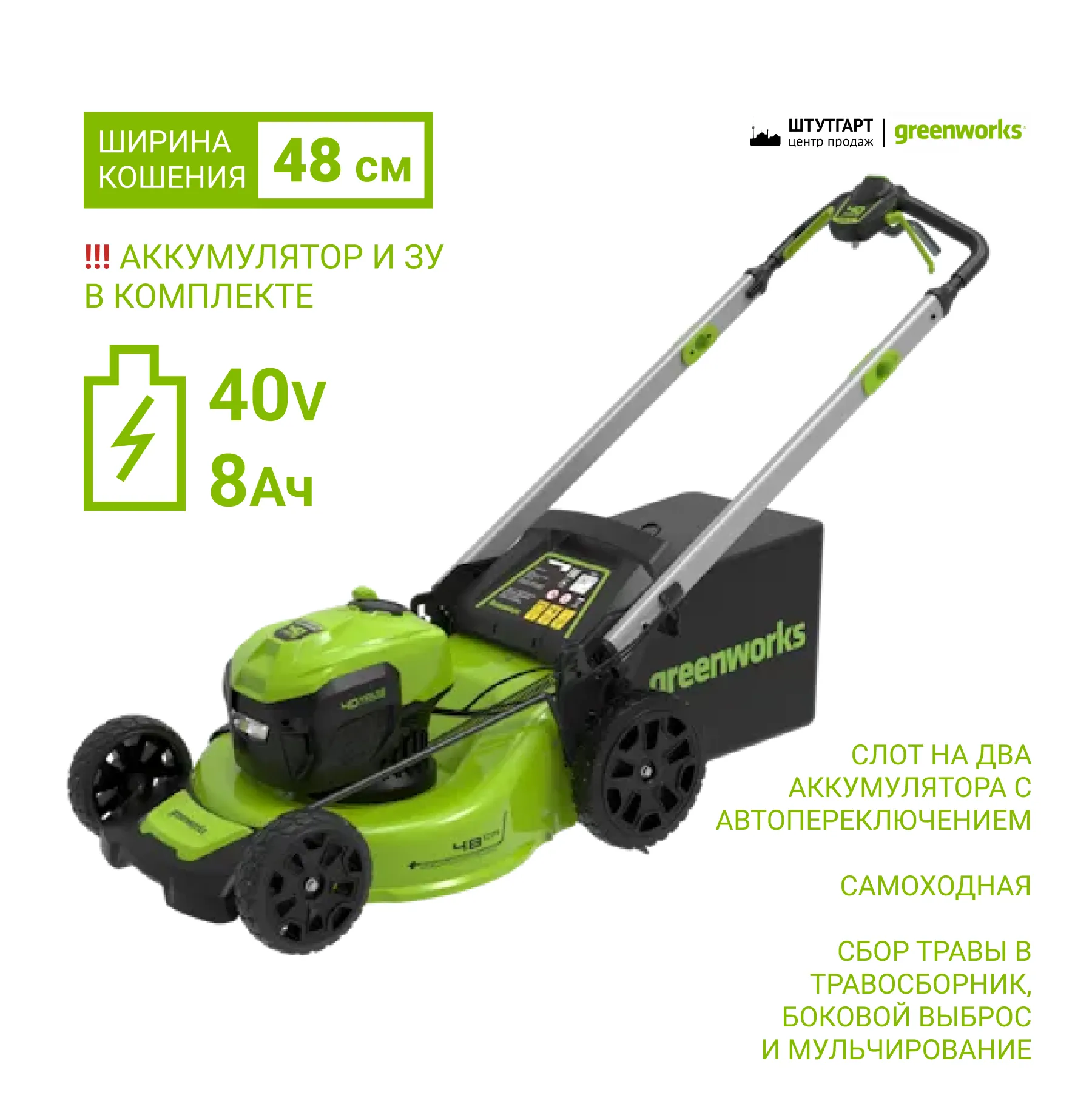 Комплект поставки | Газонокосилка аккумуляторная Greenworks; Руководство по эксплуатации; Гарантийный талон; АКБ 40V 8Ач; ЗУ 2А. |