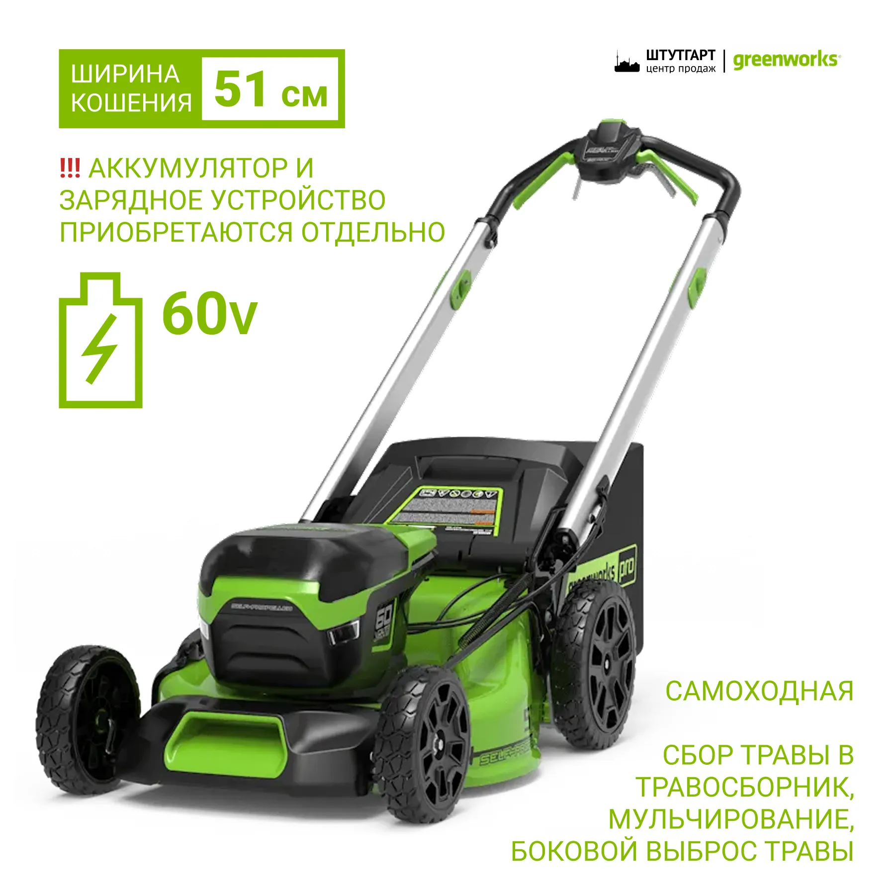 двигатель аккумуляторный, бесщеточный 60 V, раб. ширина 51 мм, высота скашивания 25–80 мм, 7 поз., травосборник 60 л, мульчирование, вес 31 кг
