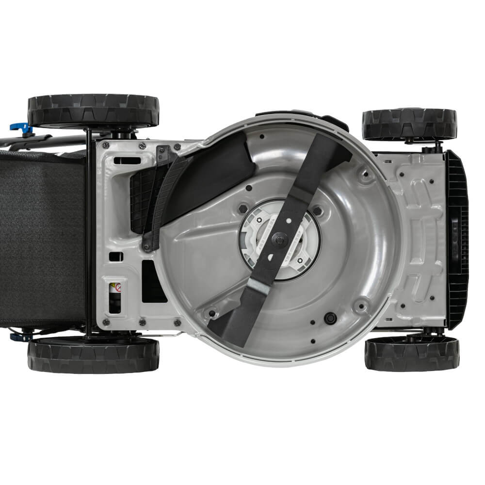 Двойная защита от случайного пуска требует сдвига бокового рычага блокировки - только после этого становится возможным запуск основным рычагом, а также предварительной активации кнопки питания, что полностью исключает непреднамеренное включение газонокосилки.