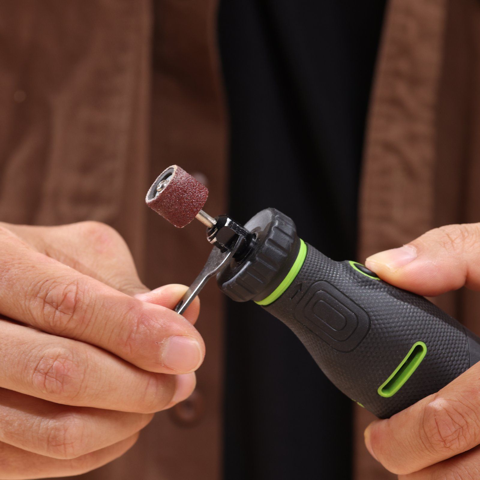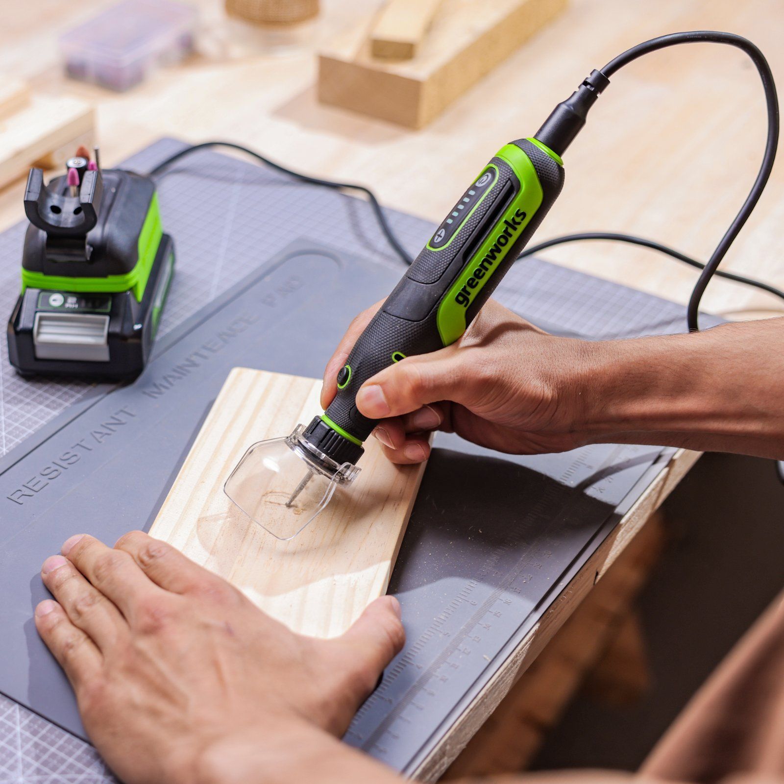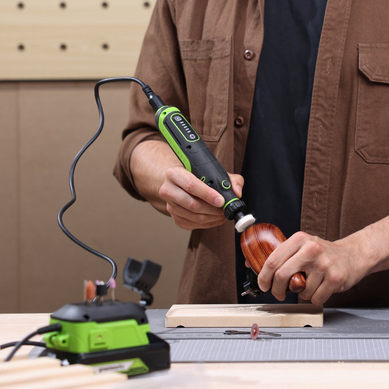 Гравер имеет съемный кабель питания и базу с поясной клипсой, что обеспечивает свободу перемещения. Компактные размеры и малый вес (всего 0,52 кг) делают его удобным для всех пользователей. Оснащен бесщеточным двигателем DigiPro™, эффективно использующим энергию аккумулятора и поддерживающим высокую скорость вращения даже под нагрузкой.