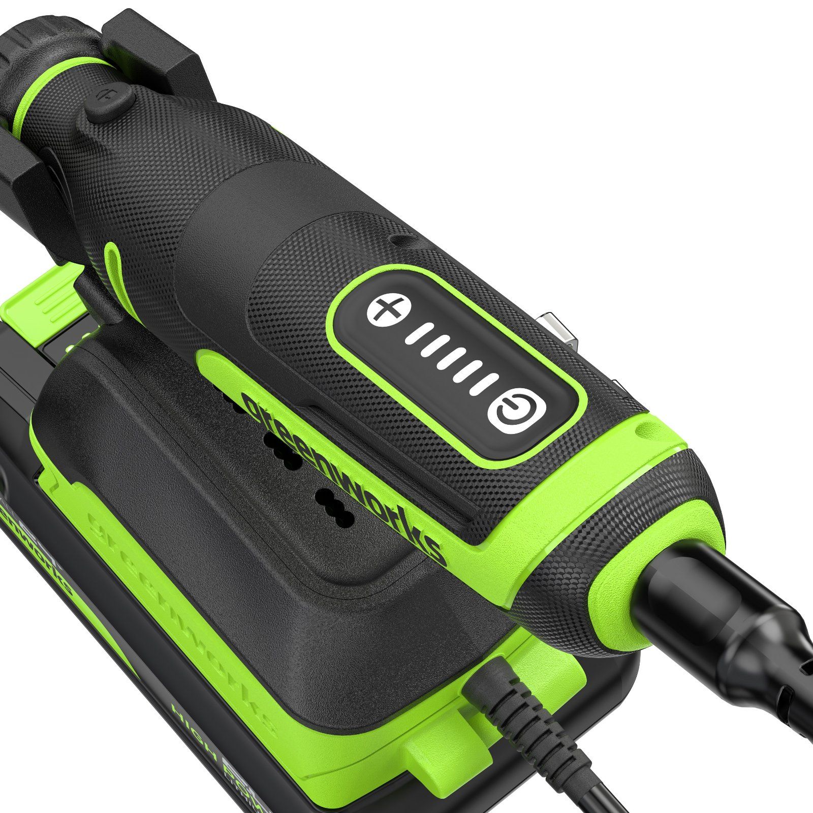 Работой инструмента управляет Greenworks Intelligent Power – инновационная система контроля и управления батареей, инструментом и зарядным устройством обеспечивающая максимальную производительность и долгий срок службы.
