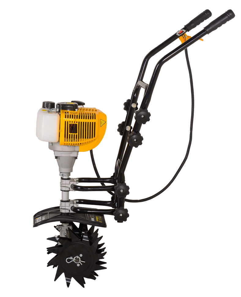 - Агрегат имеет простое управление: на правой рукоятке расположен рычаг, трос газа и кнопка остановки мотора. Одна скорость вперед не даст перепутать ход. С устройством без проблем справится любой садовод. Защитный кожух убережет работника от мелких земляных камешков.