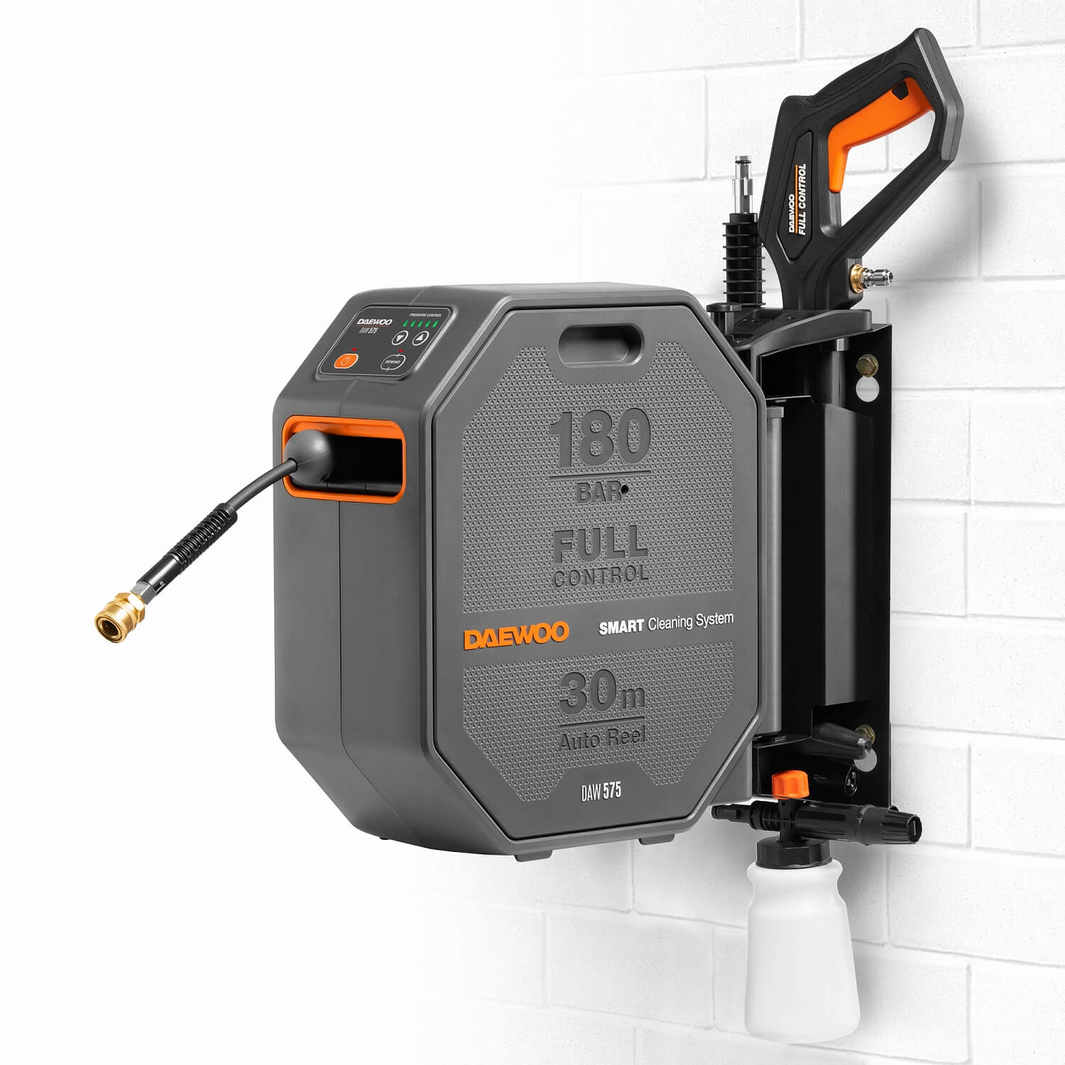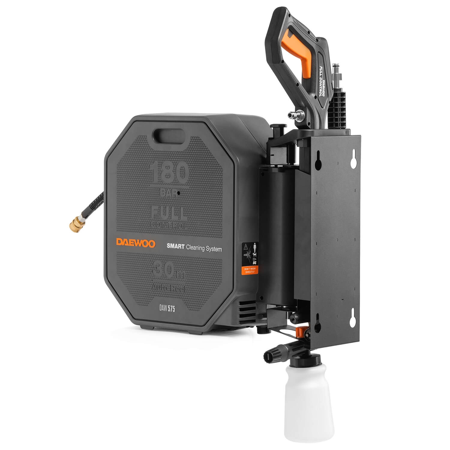 В комплект поставки входят шланг высокого давления длиной 30м, пистолет DAEWOO FULL CONTROL, моющая насадка 3-в-1 (15/25/40), грязевая фреза, входной фильтр, коннектор для садового шланга с аквастопом, поворотный кронштейн для установки на стену.