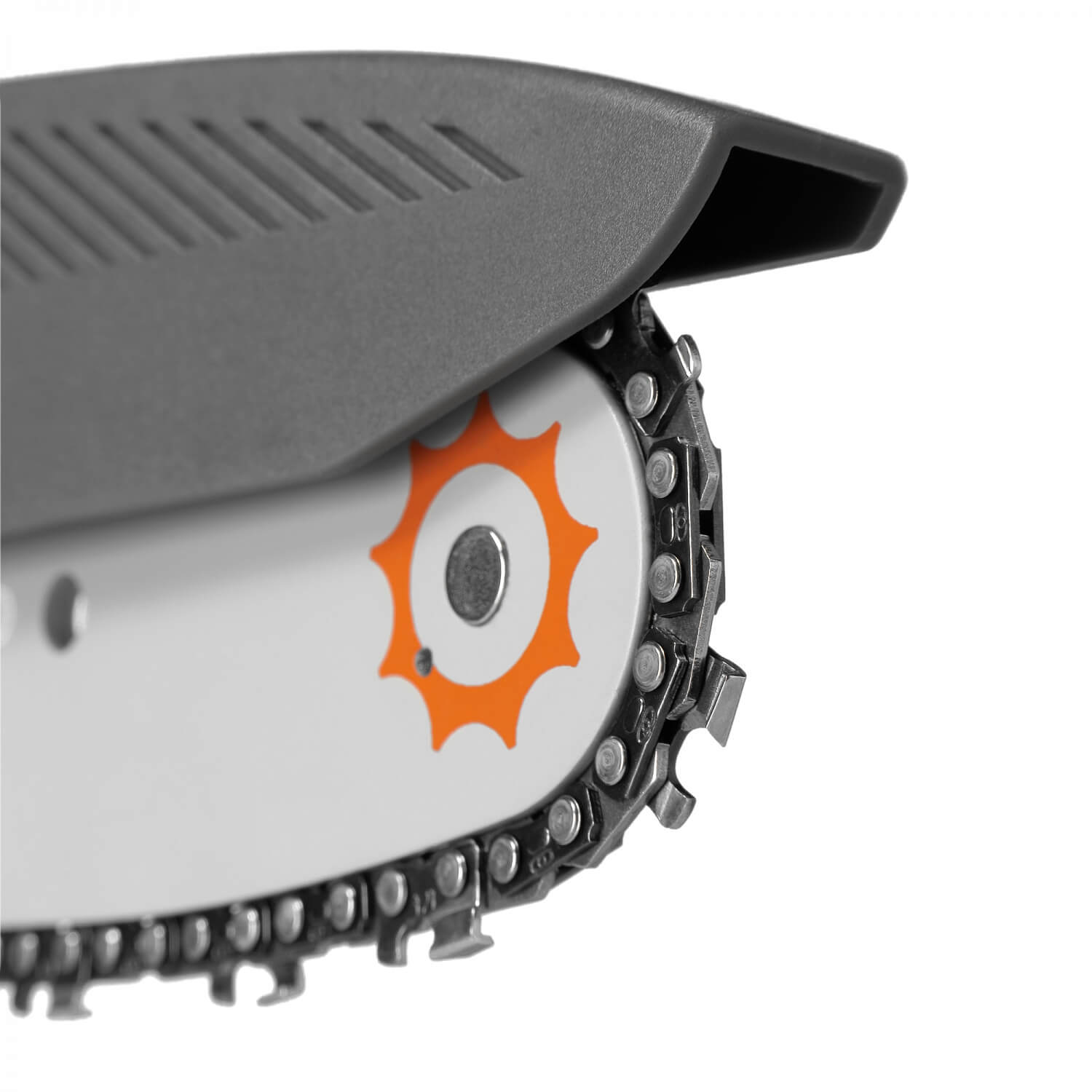 Надежная пильная цепь и шина. Двухсторонняя шина длиной 20 см и цепь с 48 звеньями и шагом 1/4” обеспечивают быстрый и чистый рез сухого и свежего дерева.
