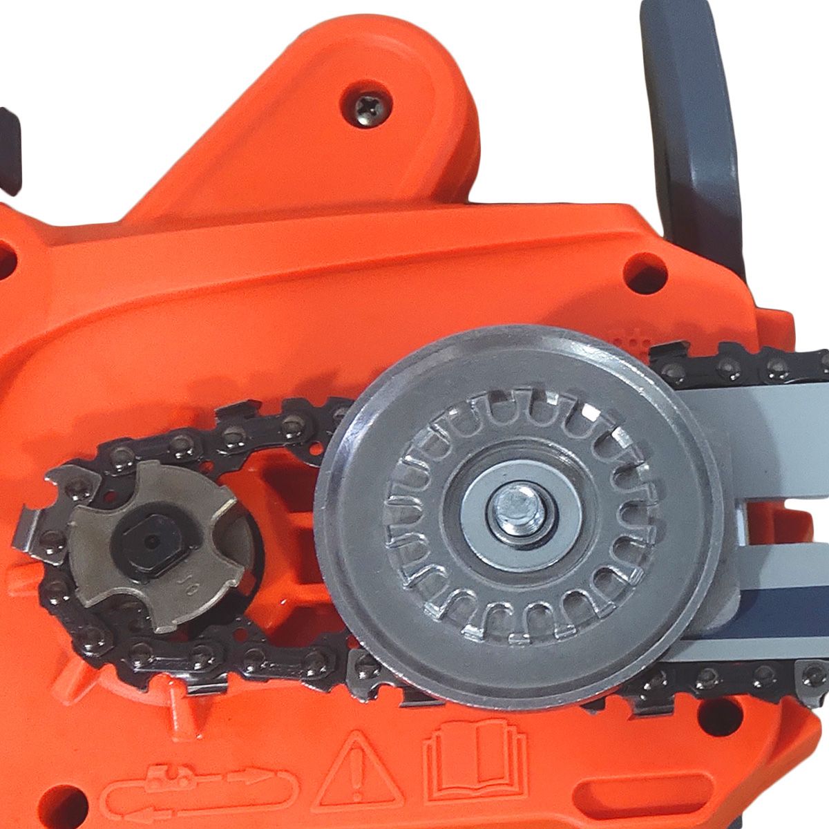 Поперечное расположение двигателя. Поперечное расположение двигателя помогает успешно справиться с пилением в вертикальной плоскости, например, с заготовкой дров. Также это решение позволяет снизить вес пилы и снять нагрузку с оператора. Металлическая ведущая звездочка. Гарантирует долговечность и надежность работы привода электропилы.