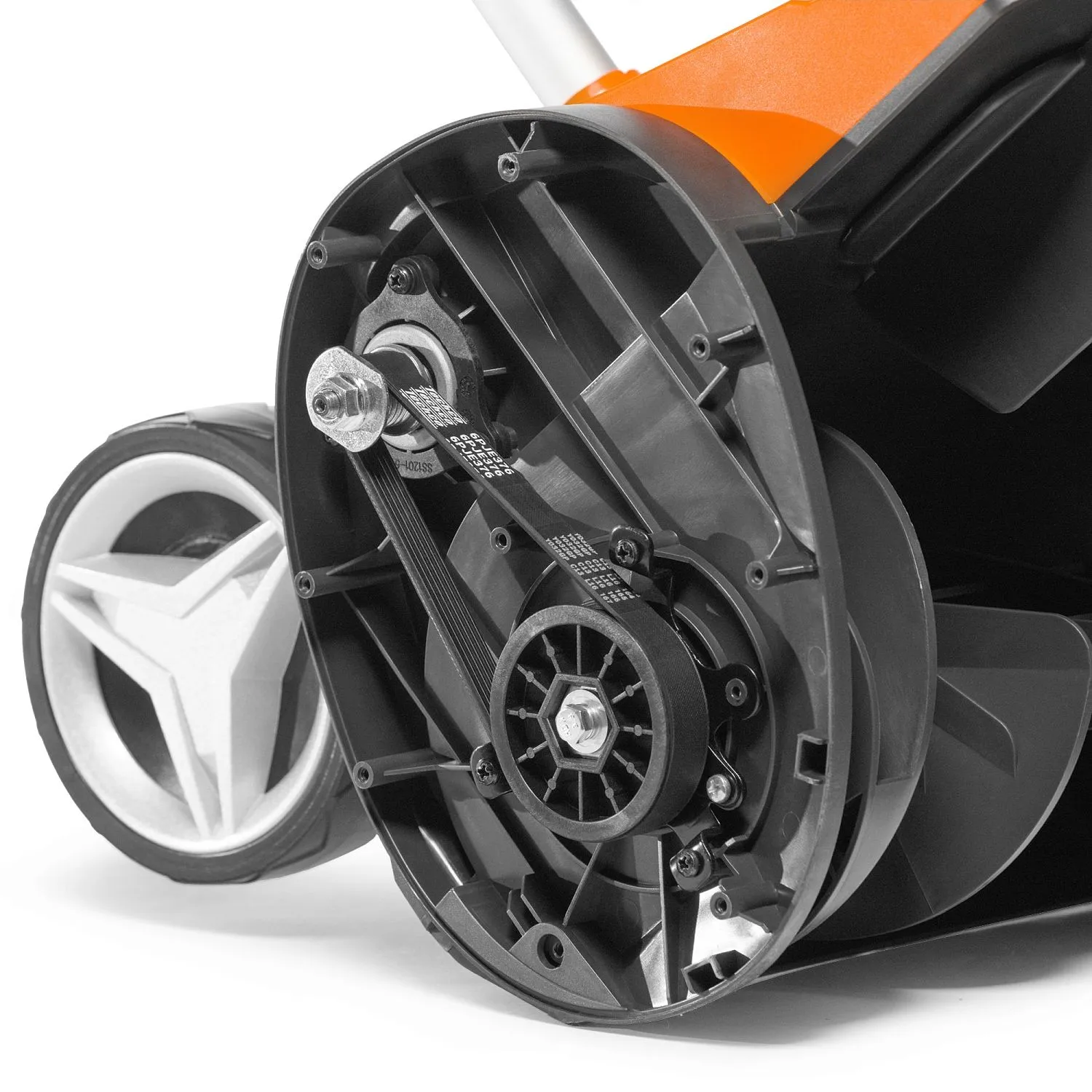 Ременный привод. Ременный привод обеспечивает надежную передачу крутящего момента от двигателя к шнеку, одновременно защищая мотор от перегрузок и повреждений в случае застревания или блокировки шнекового механизма.
