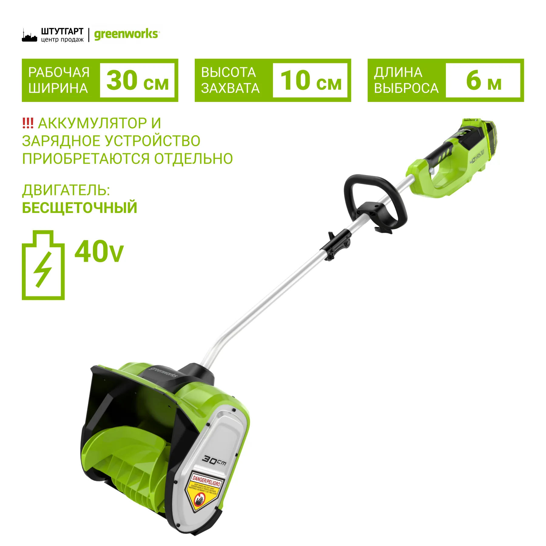 Еще одним достоинством является долгое время автономной работы от 1 батареи, до 30 минут от 4 Aч.Снегоуборщик оснащен системой защиты от случайного включения и дополнительной ручкой для крепкого хвата. Как уже было отмечено снегоуборщик входит в серию 40V и работает от аккумуляторных батарей Greenworks 40V.
