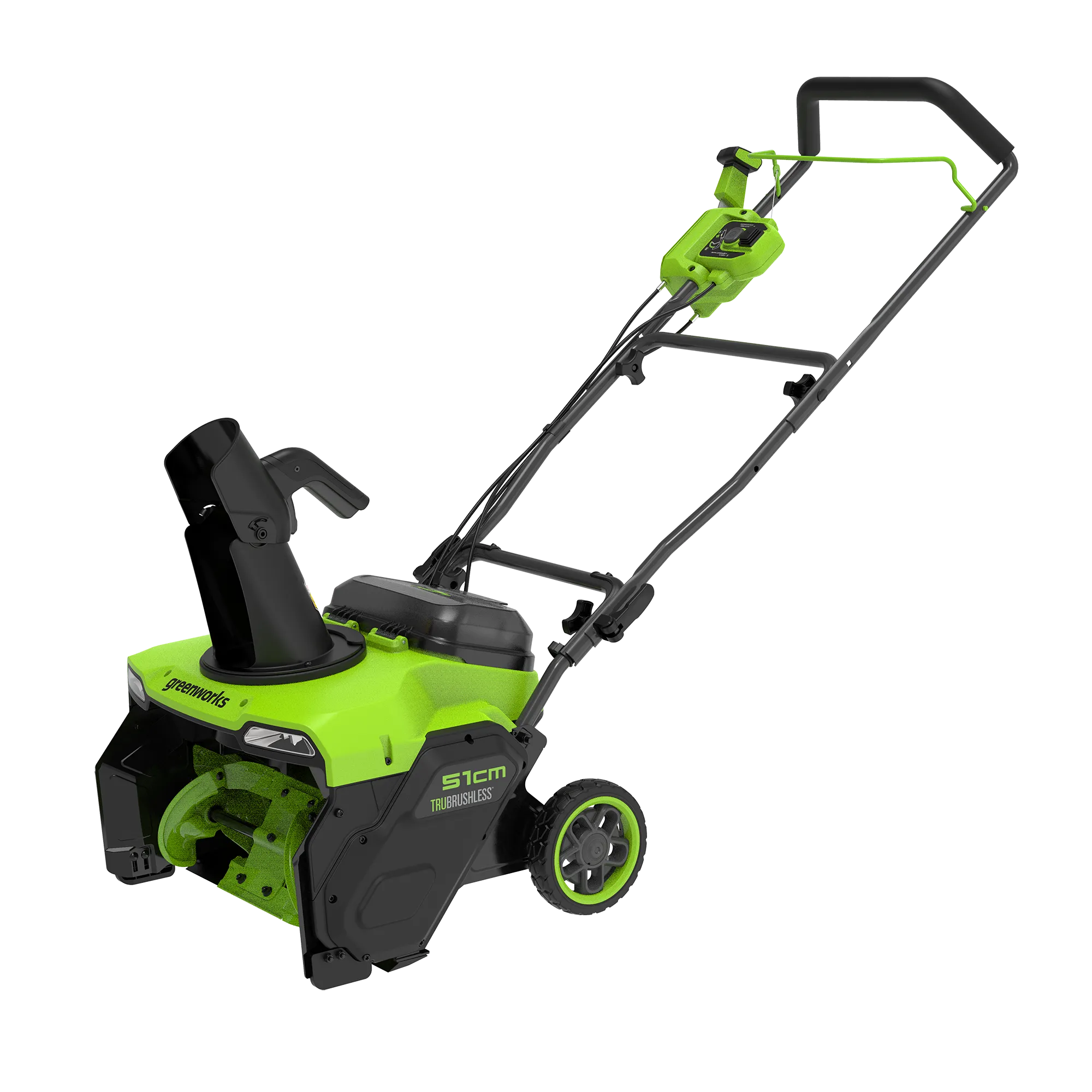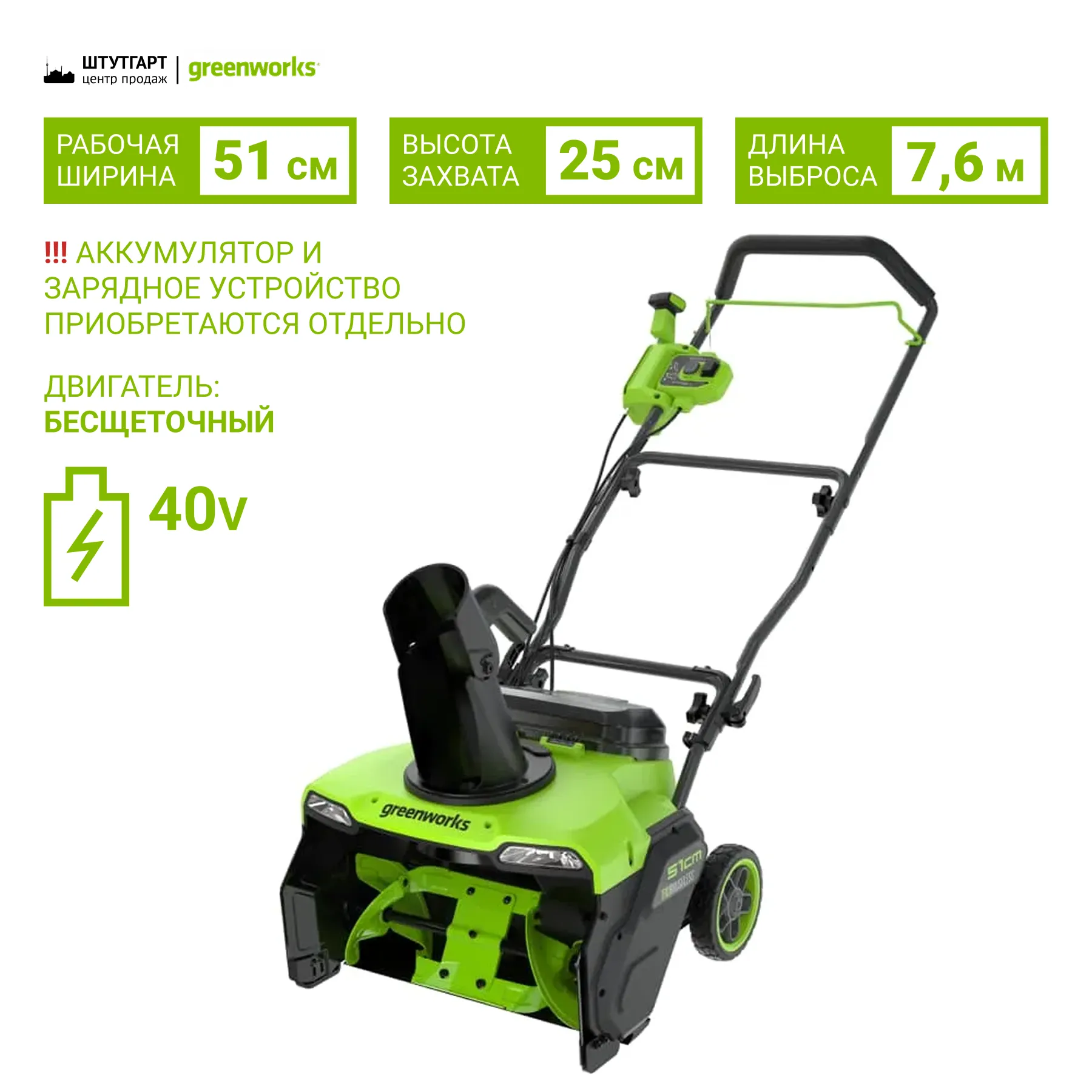 бесщеточный двигатель 40 В, раб. ширина 51 см, раб. высота 25 см, дальность выброса 7,6 м, вес 26 кг