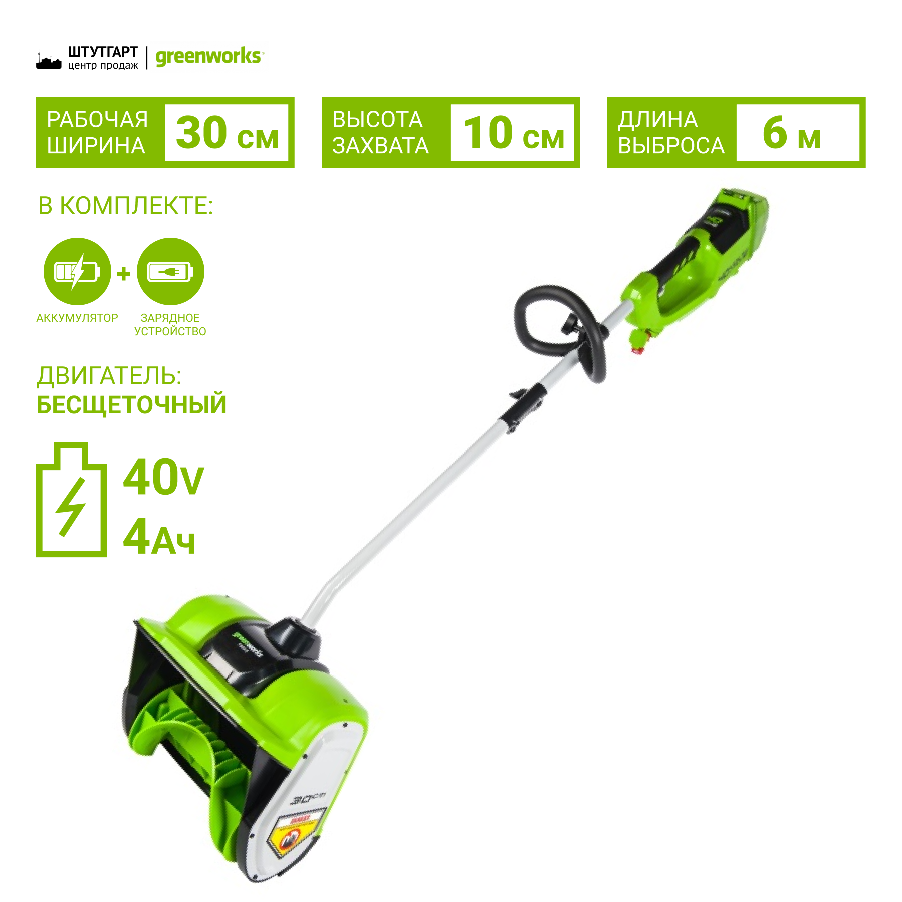 Еще одним достоинством является долгое время автономной работы от 1 батареи, до 30 минут от 4 Aч.Снегоуборщик оснащен системой защиты от случайного включения и дополнительной ручкой для крепкого хвата. Как уже было отмечено снегоуборщик входит в серию 40V и работает от аккумуляторных батарей Greenworks 40V.
