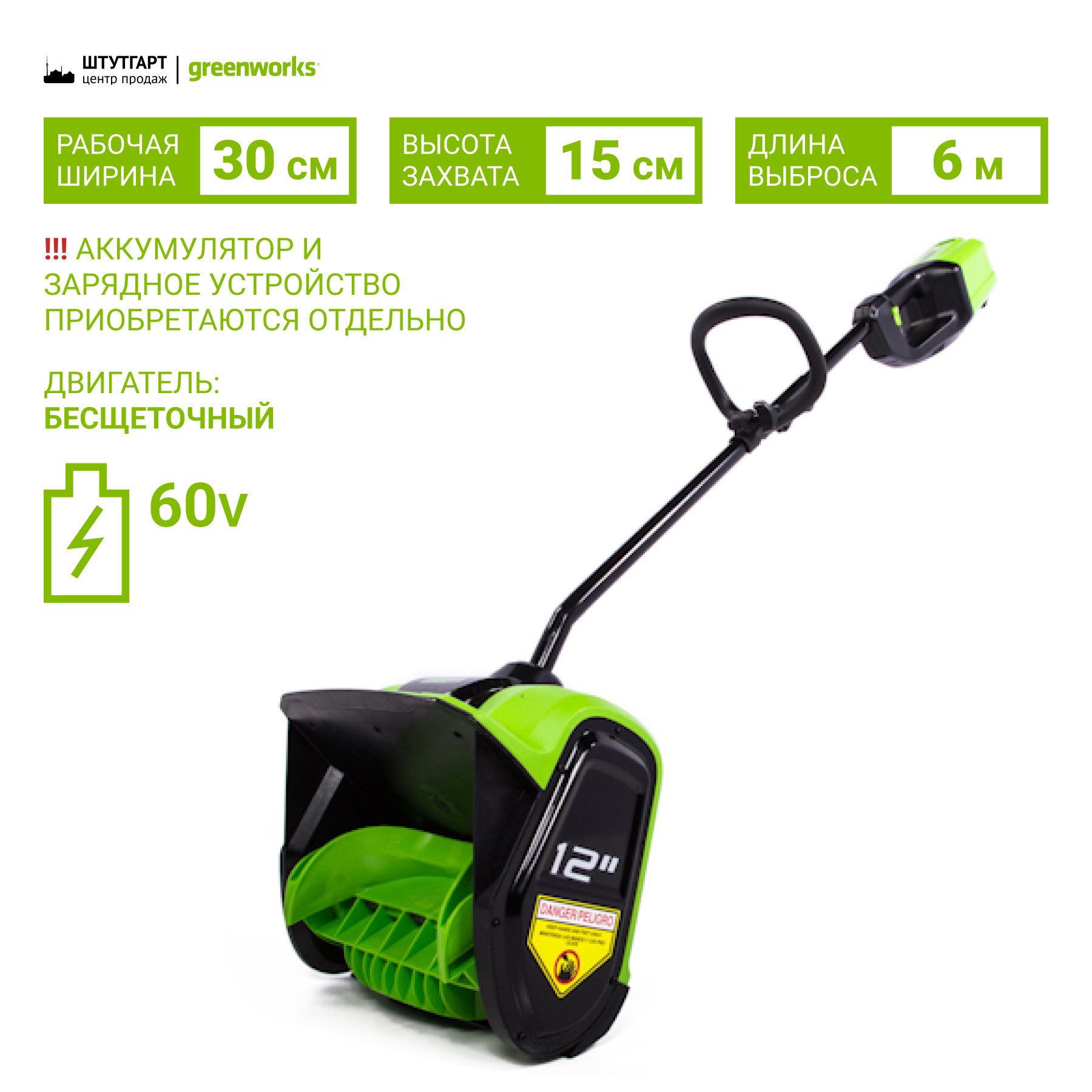 бесщеточный двигатель 60 В, раб. ширина 30 см, раб. высота 15 см, дальность выброса снега 6 м, вес 7,5 кг