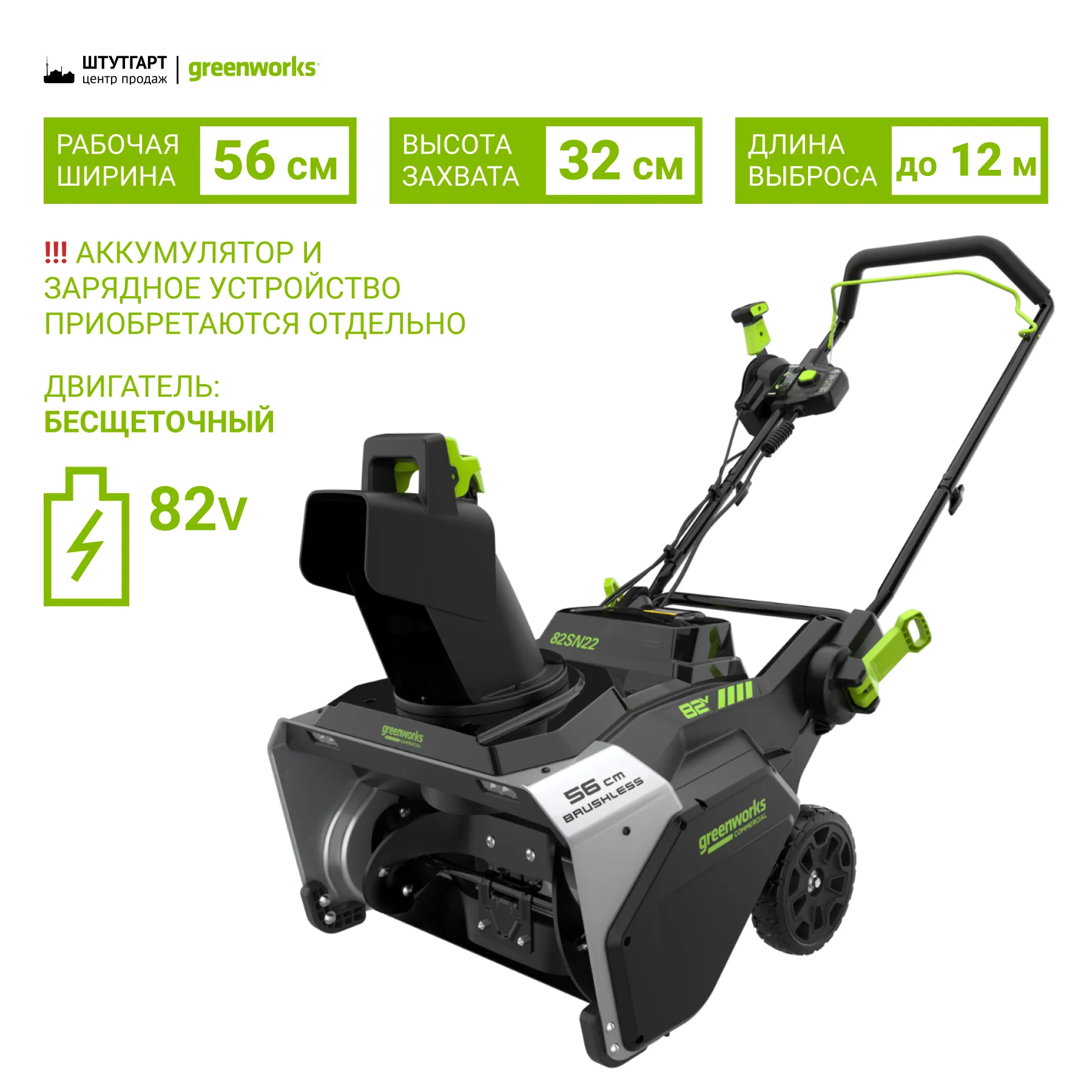 Снегоуборщик аккумуляторный бесщеточный Greenworks 82V 82SN22 (арт.2603307) — предназначен для уборки снега перед домом, гаражом, коммерческими объектами, а также очистки веранд, дорожек.
