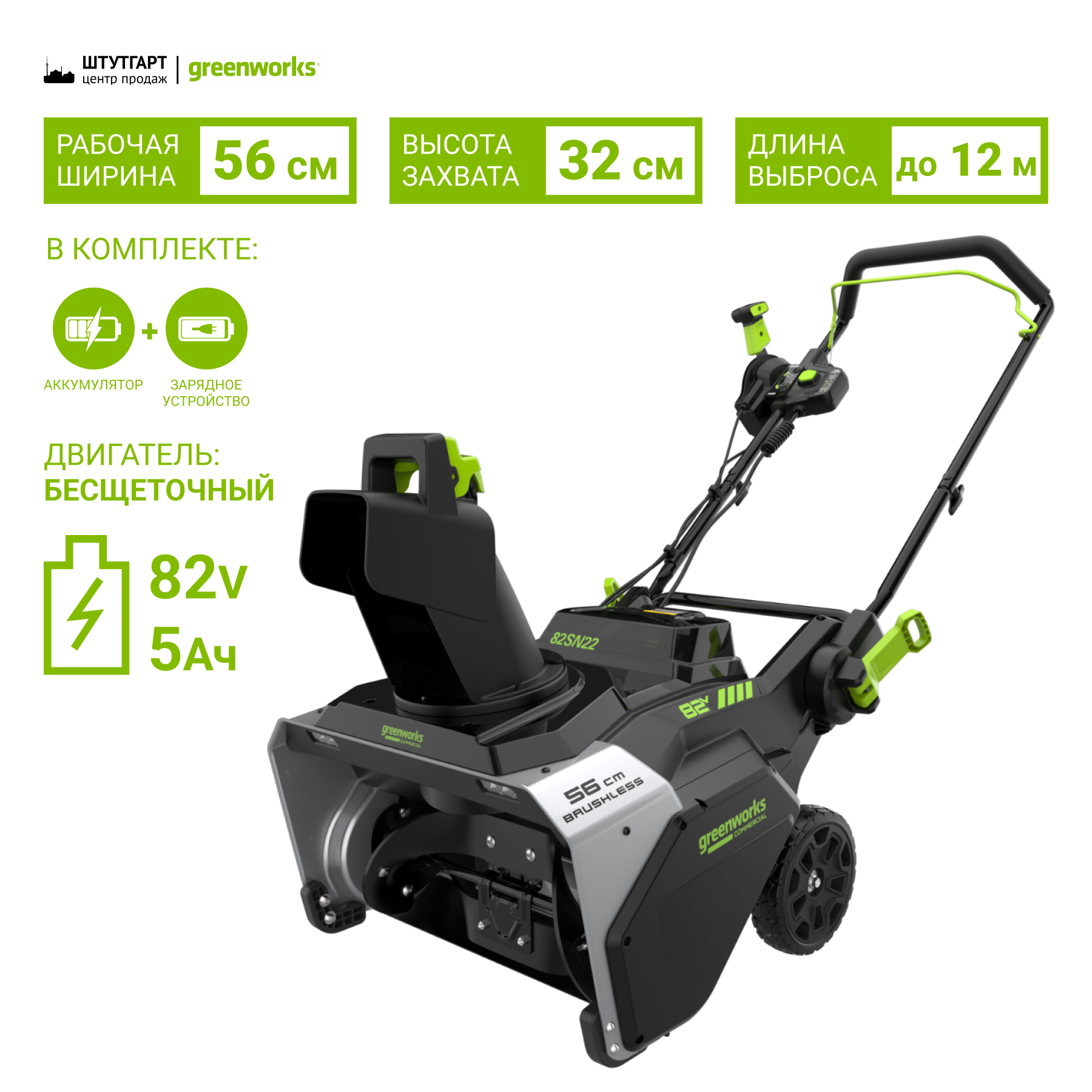 Снегоуборщик аккумуляторный бесщеточный Greenworks 82V 82SN22 (арт.2603307) — предназначен для уборки снега перед домом, гаражом, коммерческими объектами, а также очистки веранд, дорожек.