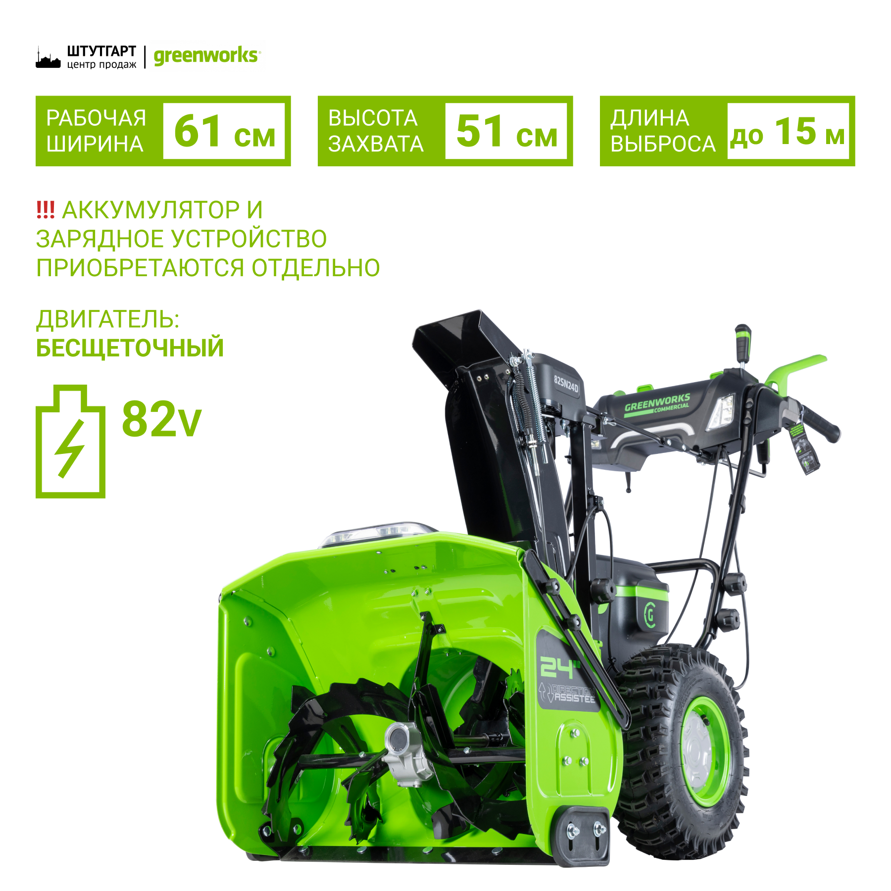 самоходный, бесщеточный двигатель 82 В, макс мощность 5200 Вт, раб. ширина 61 см, раб. высота 50,6 см, дальность выброса снега 15 м, вес 81,3 кг