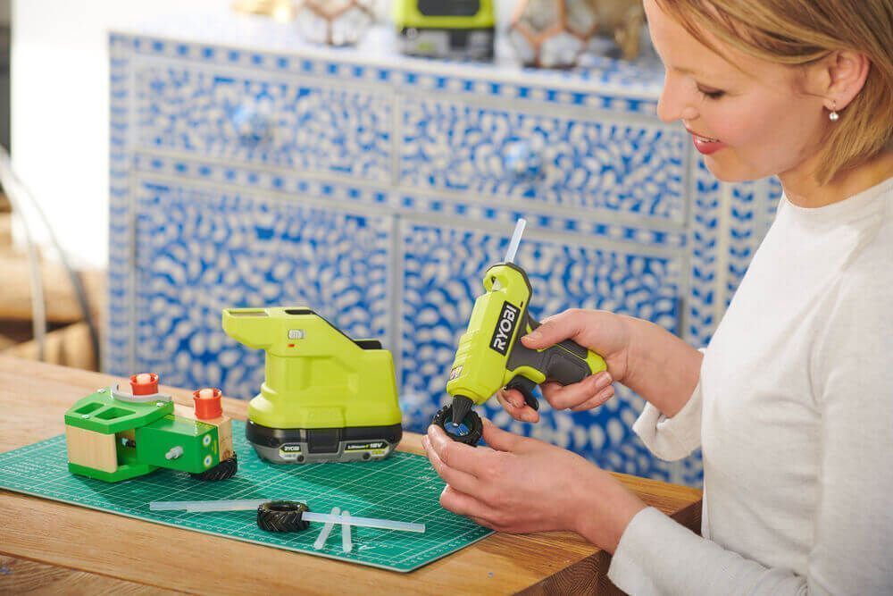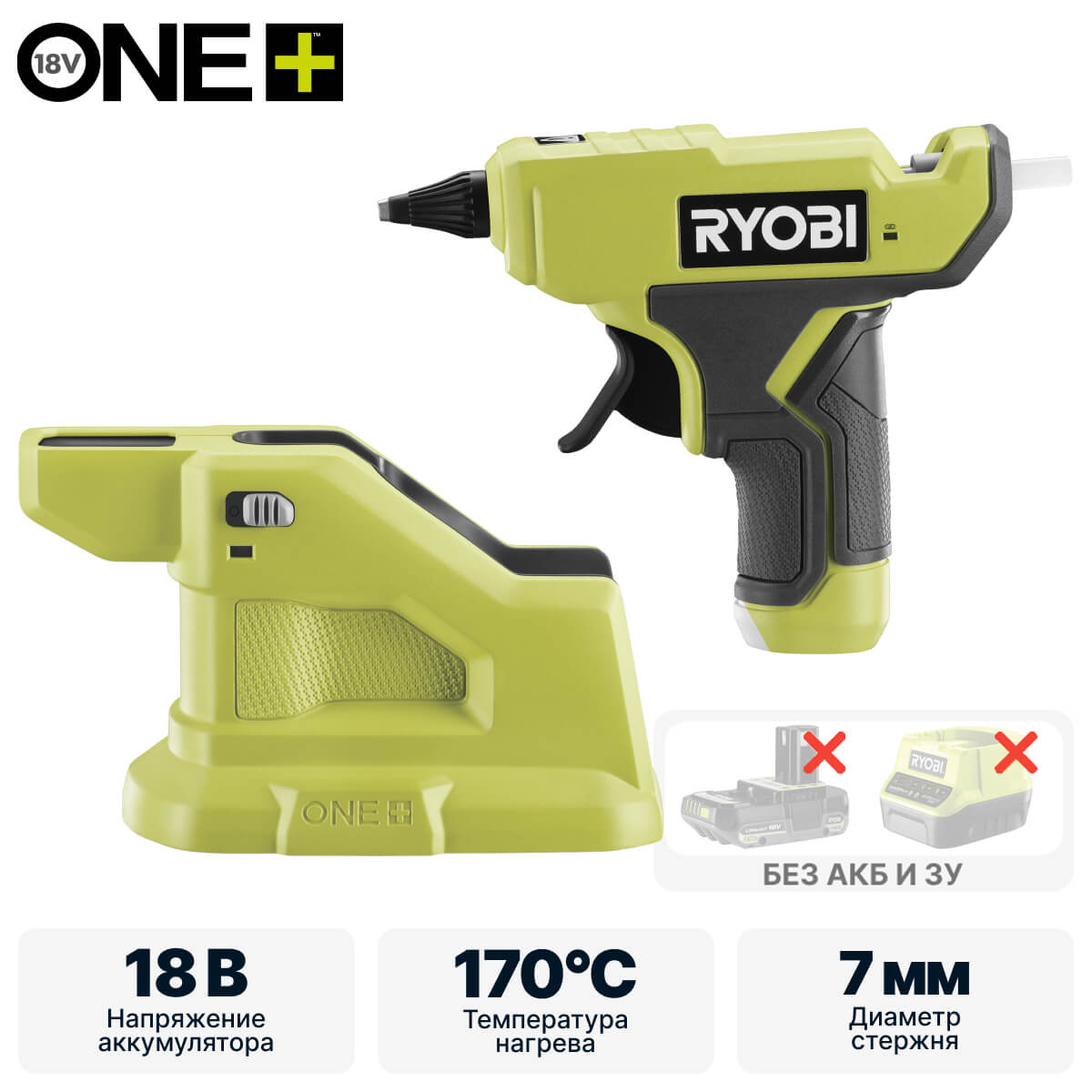 18 В, стержни 7 мм, сопло 1,8 мм, нагрев 4 мин, 185°C, 100 мини-клеевых стержней на батарее 4 Ач, вес 0,8 кг
