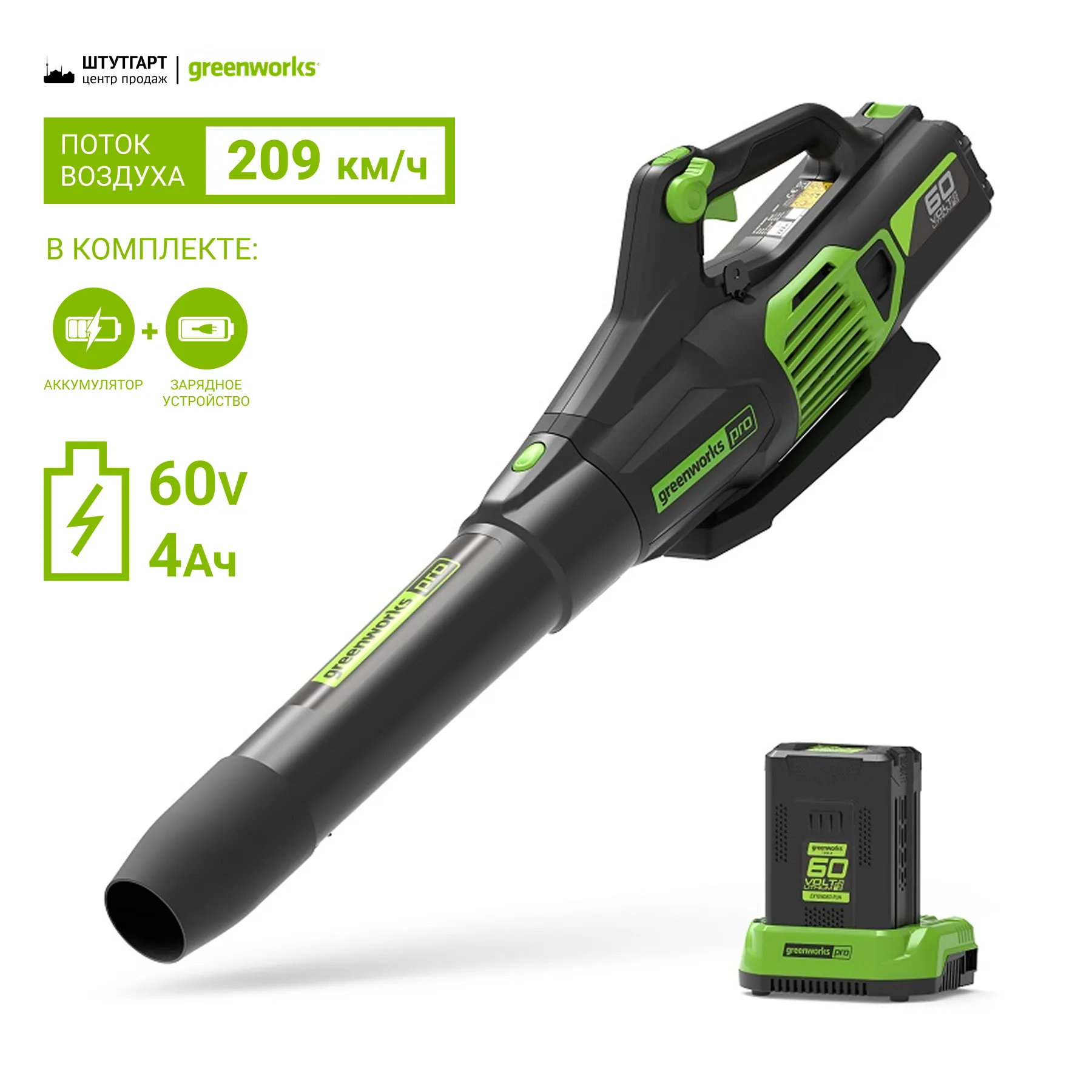 Комплект: Воздуходув аккумуляторный Greenworks 60V GD60ABK4 (арт.2405607UB) с 1хАКБ 4 Ач и ЗУ.