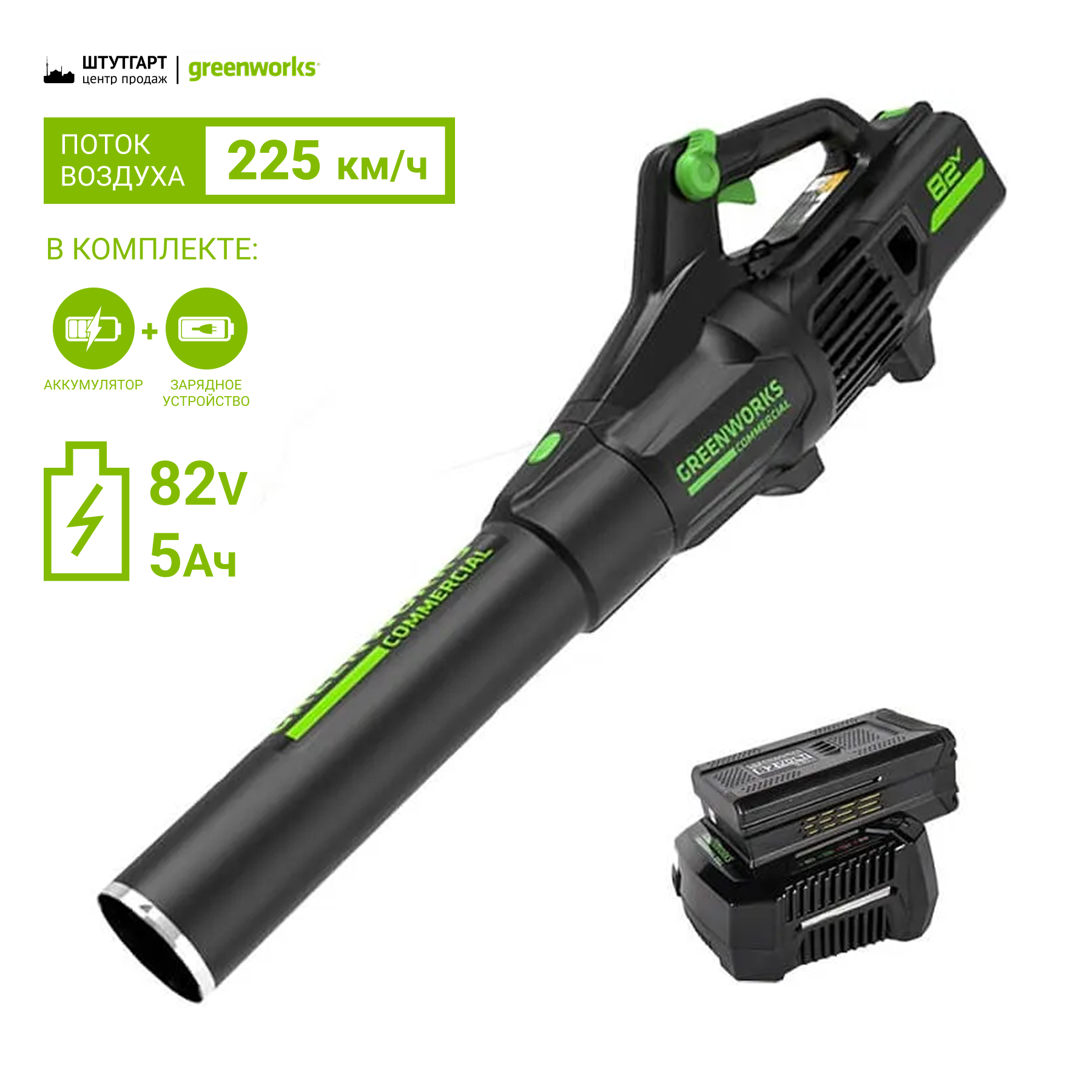 Комплект: Воздуходув аккумуляторный Greenworks 82V GD82ABIIK5 (арт.2407007UB) с 1хАКБ 5 Ач и ЗУ.