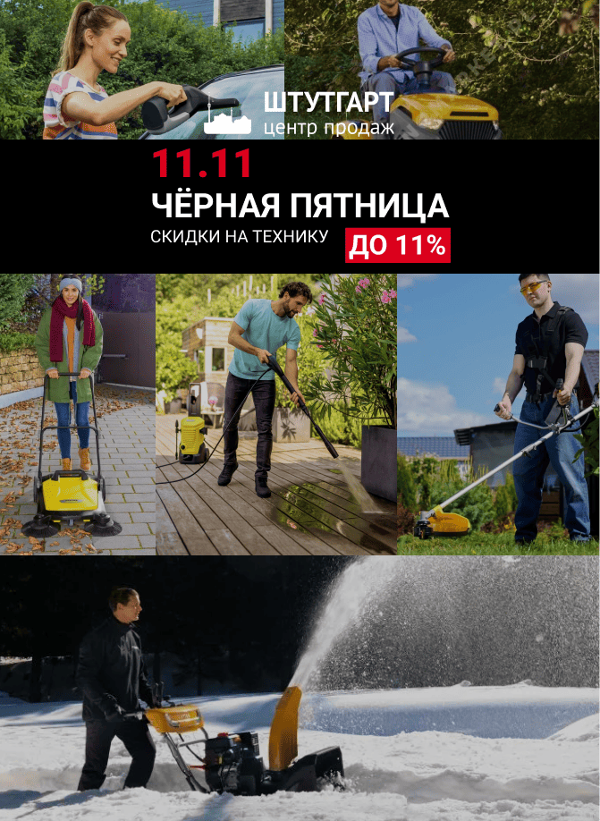 Только с 7 по 12 ноября!Скидки 11% на товары брендов Karcher, Stiga, Champion