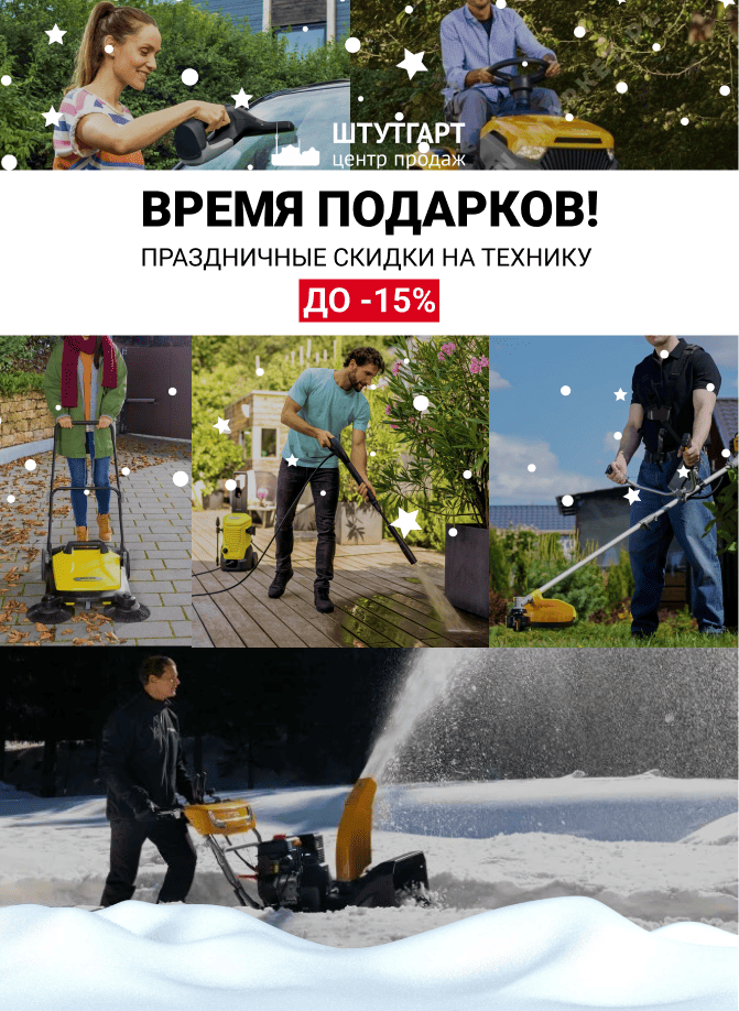 Скидки до -15% на товары брендов Karcher, Stiga, Champion, Einhell, HusqvarnaВ акции участвуют следующие категории товаров:
